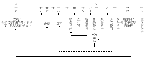论到摩西律法的礼仪,作者说:“他们洪奉的事,本是天上事的形状和影像,正如摩西将要造帐幕的时候,蒙神惊戒他说:你要谨慎,作各样的对象,都要照着在山上指示你的样式。”(八5)这节圣经中,出现了三个预表的字辞:形状、影像和样式。中文似乎是指不具实体的视觉景象,但希腊原文却不是这样。形像( hupodeigma)是一种标示,或代表、图形、仿印、样品;100影像( skia)是由帐棚( skene)引伸出来,意思是草图、速写图画、轮廓、投射图;101样式的希腊文乃 Tupos就是英文type这字的字根。中文一般将这字翻译作预表,意思是事实末出现或发生之前的预先表达,是预告(prediction)的一种,102所以兰姆表示,预表是预言的象征表记”,103或是德衙孙(A.B.Davidson)说的:“预表乃预言的一种。”104可惜这个中文翻译不大正确,并且引致一般信徒对旧约,尤其是礼仪产生很多偏差的观念。其实 typos就好像英文的type字的意思,105是刻出来的痕,打成的图形、印痕、例证、模型、类型的意思,毫无预告的含意。106希伯来书这节圣经是引用出廿五40,该处七十士译本以 107来翻译希伯来文的 tabn|th,意思是模型。108来九25、28两次说基督的舍命救赎不像或像大祭司的献祭,可见利未记的献祭仪式是一个救恩模式,可作新约时代耶稣的救赎工作比较。所以神在西乃山给摩西的指示,并非让他在脑海想象中浮现出会幕的观念,而是有实物的形像让摩西观看,109然后他用以色列所能想象和了解的象征将它表达出来。当然摩西见到的不是与地上一模一样的建筑物,而是神用视听教材,形容那个无法描述的荣耀。