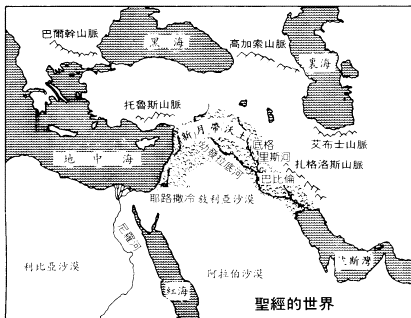 圣经的世界是欧亚非三洲汇合的地方,有几个重要的地理特征。由大西洋到亚洲东南,有一条连绵的山脉——庇里牛斯山、阿尔卑斯山、巴尔干山脉、高加索山脉、艾布士山脉、兴都库什山脉,
