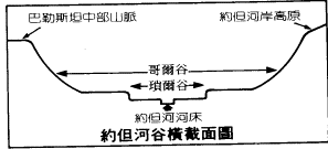 从约但河的横切面可看出,它实际上是一山谷内的山谷。最大的那个山谷有一阿拉伯名称——哥尔(Ghor),它由撒玛利亚的山丘,绵延至河东高原的边沿,在加利利海以南的部份有五哩阔(八公里),到了耶利哥就超过十二哩(二十公里)。在哥尔谷内,有另一个锁尔谷(Zor),被称为约但的「森林」或「至宝」 结十一3),水深十至二十尺(三至六米),阔一百五十尺(五十米),它的两岸几乎是垂直的。在锁尔谷内,就是真正的约但河道,有十五至二十五尺(五至八米)阔。因为河水在两季泛滥到锁尔谷外,所以两岸便长满浓密的树木。