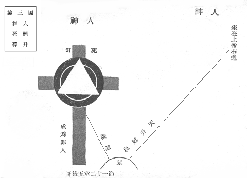 这图左方的圆形是表明人罪的情况,十字架上的金色三角形是表明基督乃荣光的主,是神的儿子,他离天上的荣位降生成为人,负世人的罪钉上十字架,所以金色三角形外的黑圆形,是基督因我侪而成为罪人的意思。基督本无罪,但他因是救主,要担罪人的罪,世人所有的罪都尽负之于十字架,所以圣经明言他无罪而成为有罪,他负罪在十字架时,甚至父神也离了他。