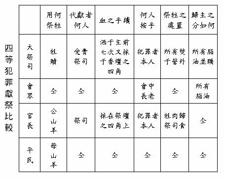 受膏祭司所献之赎罪祭,其祭牲及手续,比较官长及平民,甚有分别,看表可详知。如洒血之工,须到主前弹七次,又要抹于香坛之角,(六,七节)此可见祭司犯罪在主前视为甚大之事,与主之圣义有何关系,故要带血入到圣所,在主前弹七次,(七次意即完全)又要抹血于香坛之角上,此表求赦之意。我们为心灵界领袖之人,即牧师传道等,犯了一件人所视为普通寻常之罪,或人不以为罪之罪,而心内常受甚重之警责,有时虽已悔改,然觉尚有余痛,何故?此即弹之工未至七次,又未作抹血香坛角上之工也;较之平民犯罪,他们不过在祭坛四角上抹血,即可了事,(卅五,卅节)大不同也。何以上帝特别严待祭司较他人为重?在十章七节有云“因为耶和华的膏油在你们的身上,”既如此,则必受鞫更严;(雅三章一节)且因“受膏祭司犯罪,使百姓陷在罪里,”(三节)所以有此严重之赎罪手续。我们由此则知地上之祭司,尚有如此软弱,故圣经屡言祭司先为己献,后为民献;但我们在天之大祭司,耶稣基督,根本无罪,亦不为献赎罪祭,只有常常举手为其民代祷而已。