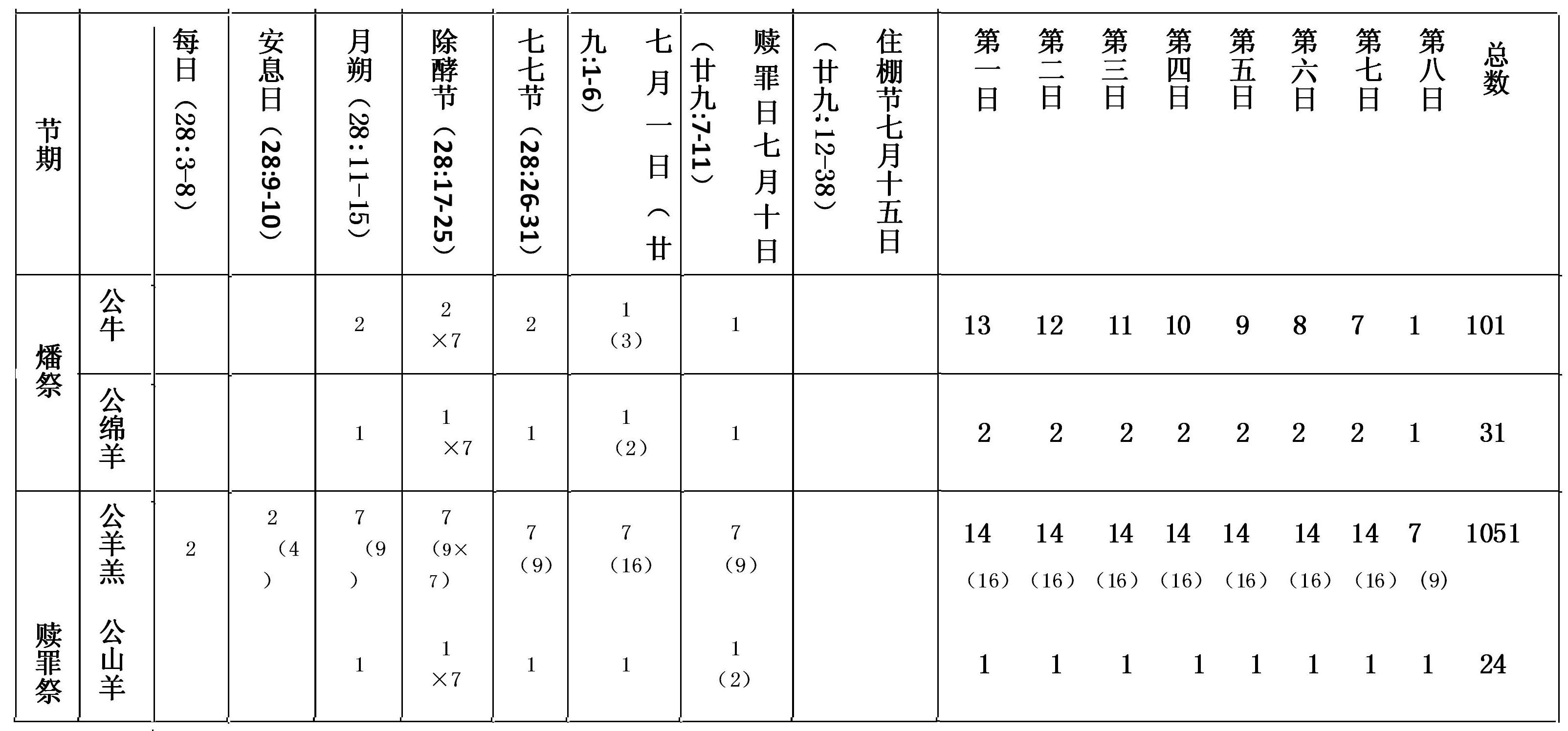 总数 (参28:23) 。 以下为一年所献各类的祭牲,括号中的数字为日子重叠时祭物的总数。