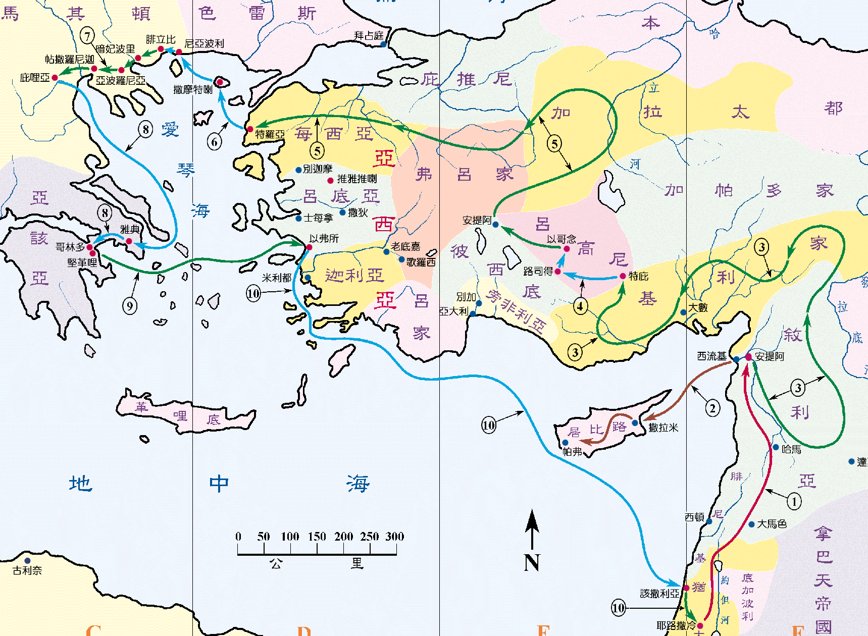“他就走遍叙利亚、基利家,坚固众教会。”-- 保罗的第二次旅程跟上次不同,这次是从安提阿开始,由陆路北上,走遍叙利亚(Syria)、基利家(Cilicia)。请看图一。基利家在哪里?这是一个罗马帝国的省份,大数是其省会,大数之西是山区,东则为平原,因三面环山,仅有一险要的隘口名叫基利家门,是连通土耳其和叙利亚的交通孔道。过去,我们有读到保罗在归主后,在耶路撒冷传道,因为面对犹太人的谋害,不得已才逃往大数(徒九:30)。后来巴拿巴趁到安提阿的机会,把保罗从大数找来,带他回安提阿教会,和他在教会事奉整整一年(徒十一:19 - 26)。我们相信保罗这次一定有到大数,坚定那里的教会。