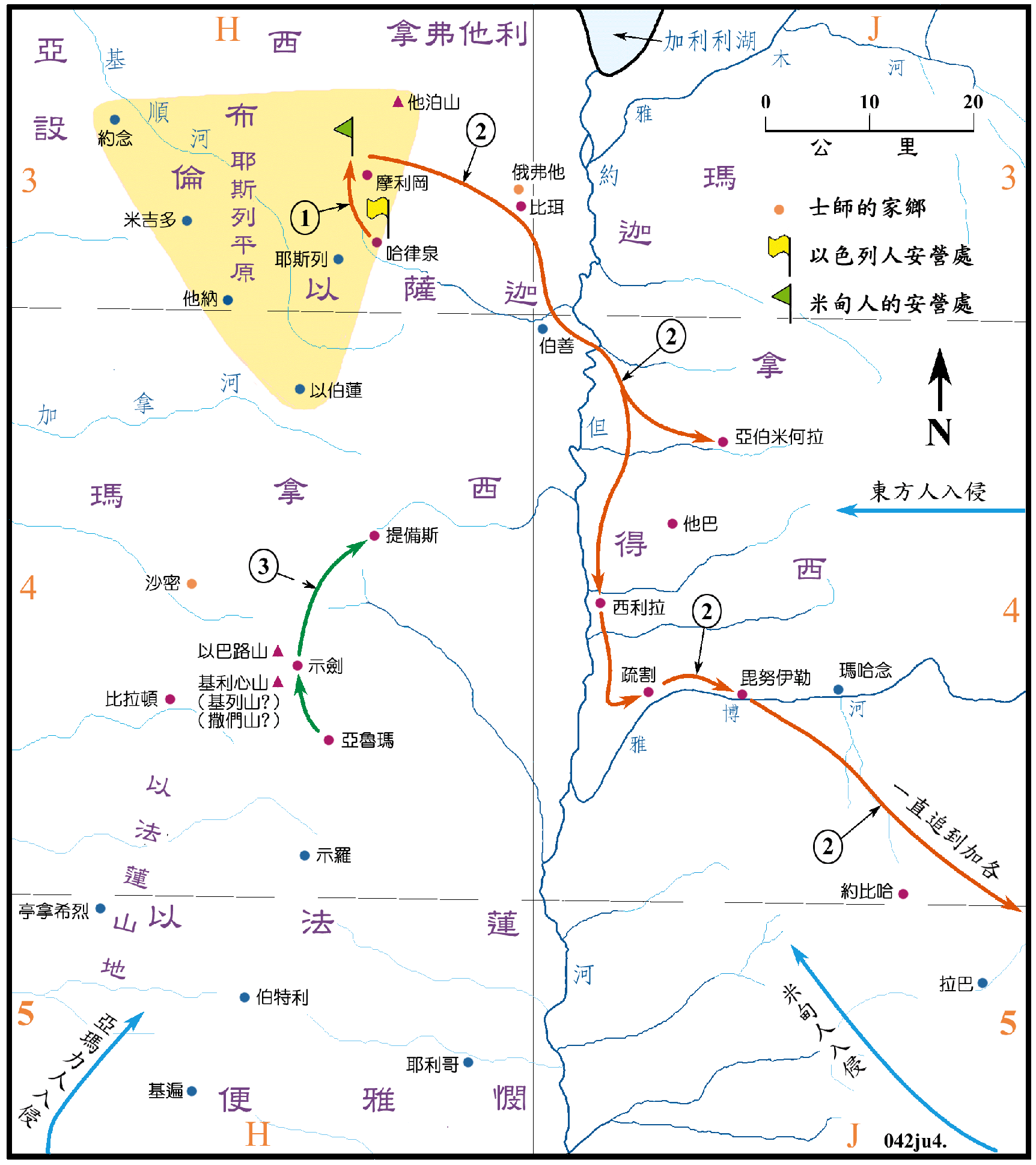 “耶和华使全营的人用刀互相击杀,逃到西利拉(Zererath)的伯哈示他(Beth - shittah),直逃到靠近他巴(Tabbath)的亚伯米何拉(Abel-meholah)。”-- 请看图一。这都是约但河东的地方。追赶他们的有拿弗他利、亚设和玛拿西支派的人,他们是从开头就跟随基甸的支派(士六:35)。