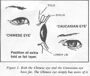The fact is, however, that there is only one skin color : melanin. This is a brownish pigment which we all have in special cells in our skin. If we have none (as do people called albinos, who suffer from an inherited mutation-caused defect, which means they lack the ability to produce melanin), then we will have a very white skin coloring (actually pink-white because of blood vessels showing through the skin). If we produce only a little melanin, it means that we will be European white. If our skin produces a great deal of melanin, we will be a very deep black. And in between, of course, are all shades of brown. There are no other skin pigments; other factors such as the extra thickness of the overlying skin in the Chinese, for example, can give a yellowish effect. And this is not only true for skin color. Whatever feature we may look at, no race has anything which is, in its essence, uniquely different from that possessed by another. For example, the Chinese eye, or almond eye, gets its appearance simply by having an extra fold of fat (see Figure I). Both Chinese and Caucasian eyes have fat - the latter simply have less of it.