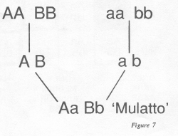 We know that skin color is governed by at least two (possibly more) sets of genes. Let's call them A and B, with the correspondingly more silent genes a and b, in a similar way to the eye example. (The small letters in this case code for a small amount of melanin.) So a very dark race which, on intermarriage, kept producing only very dark offspring, would be AA BB; the same situation for a very fair-skinned race would be aa bb. Let's look at what combinations would result in a mulatto (the offspring of an AA BB and aa bb union). (See Figure 7.)