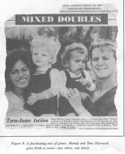 If these pure lines were to interbreed again with other such lines, the process would be reversed. In a short time, their descendants would show a whole range of colors, often in the same family. The photo in Figure 9 shows what were called Britain's most amazing twins. One is obviously white, the other obviously dark-skinned. Of course, this is not amazing at all when you do the exercise on paper, based on what we have discussed. (A clue if you want to do it yourself; mother cannot be AABB. )